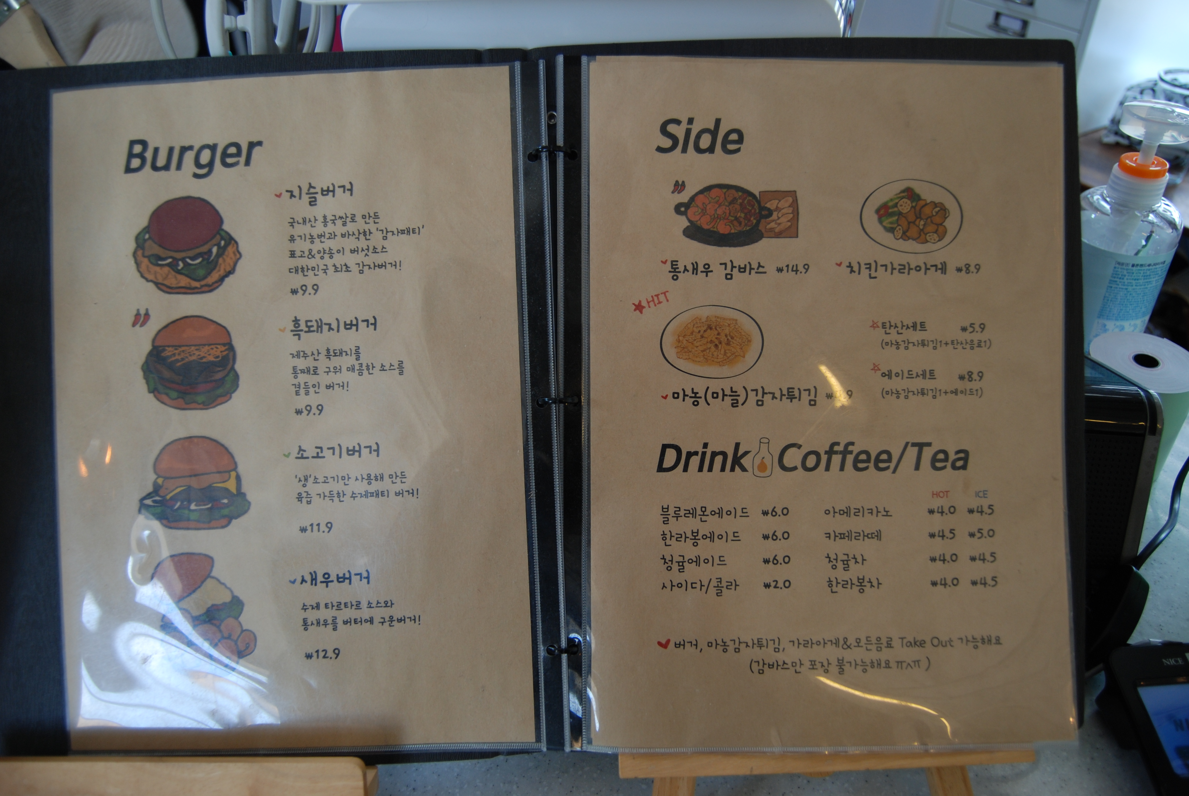 일하고 계시는 분과 반려견 입장 시 유의사항 등을 여쭤보고 전 새우가 들어간 수제버거를 주문했습니다.